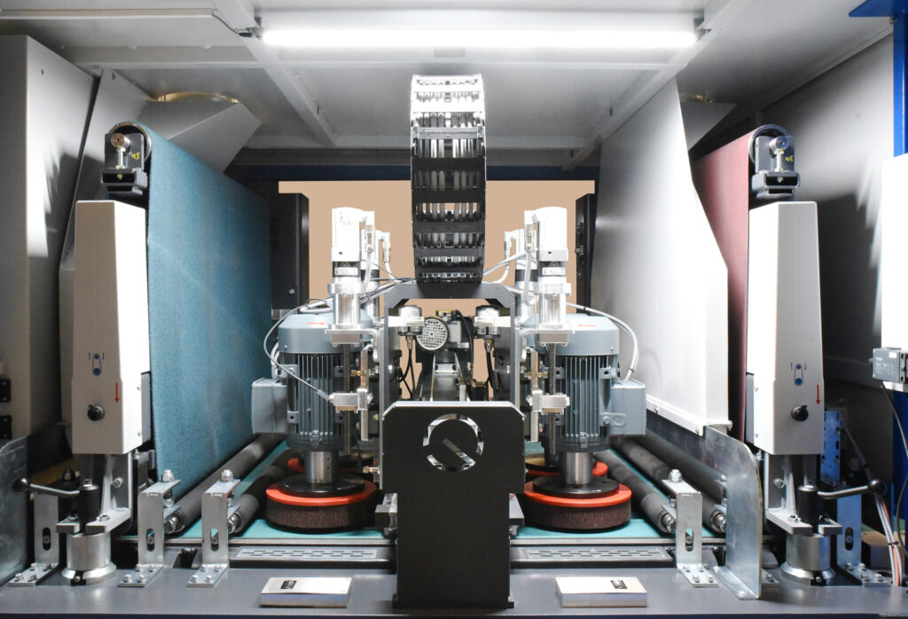 Pendelende unit met twee rijen topborstels voor een uniforme afronding van alle randen en binnencontouren. Effectiever contact op de contouren door een pendelslag over de volledige werkbreedte. Snelheid en druk per borstelrij instelbaar. Mogelijkheid tot verschillende borstelcombinaties (2+2).